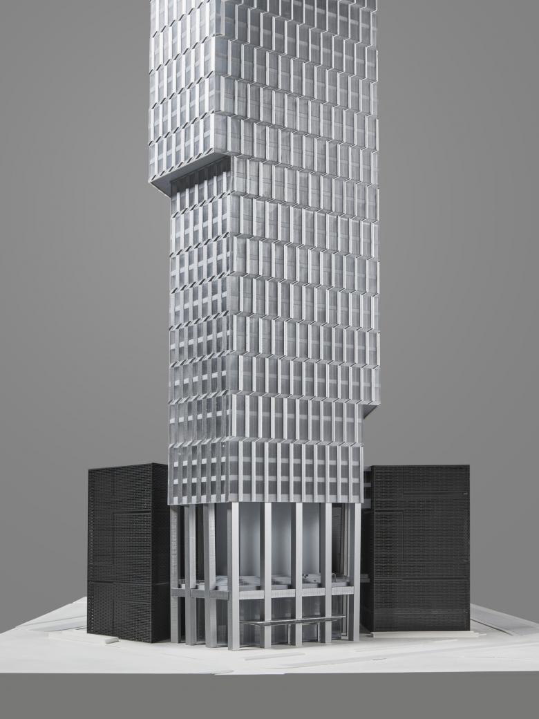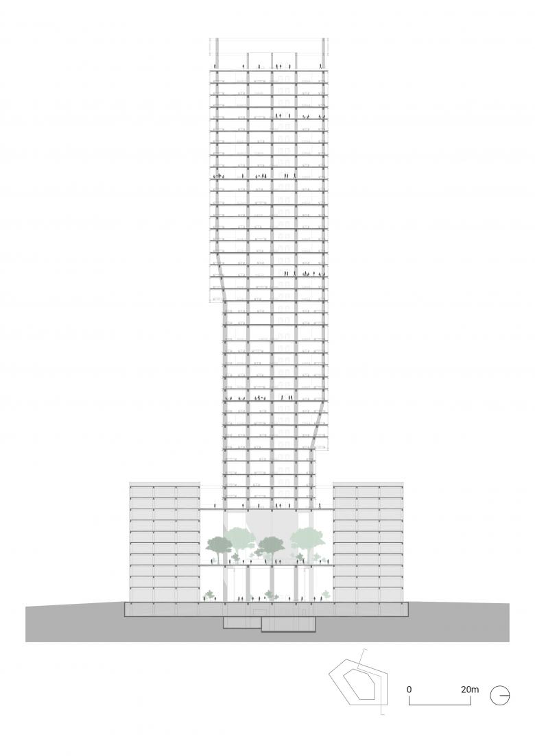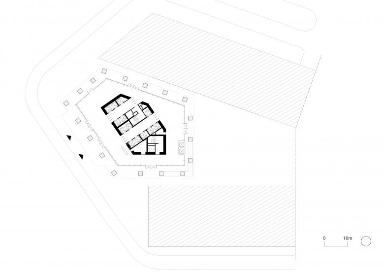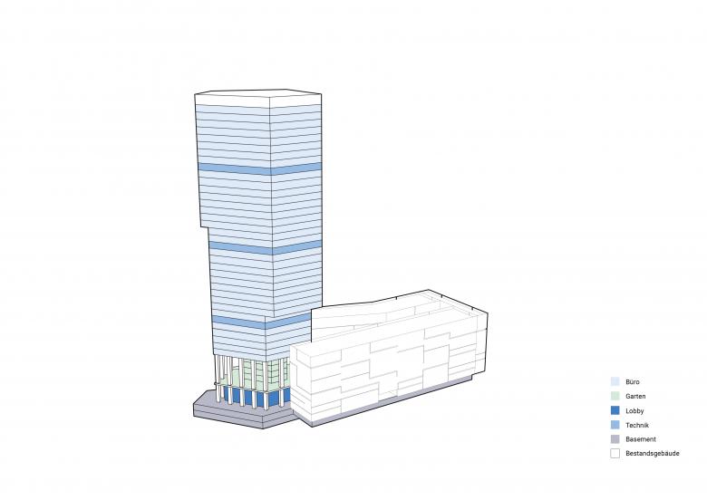 The tower base is nestled between two existing office wings, on the narrow space that is still free on the site. The pentagonal footprint of the new high-rise is the result of maximizing the given space on site. The relatively small floor area of the open base floors is extended in the upper office floors as the tower rises above the existing buildings towards the sky. This extension creates distinct cantilevers, which mark the entrance to the software park and relate to its urban surroundings: its neighboring buildings and the park. The tower’s sculptural overall shape is characterized by the consciously placed cantilevers and varies depending on the viewpoint.
