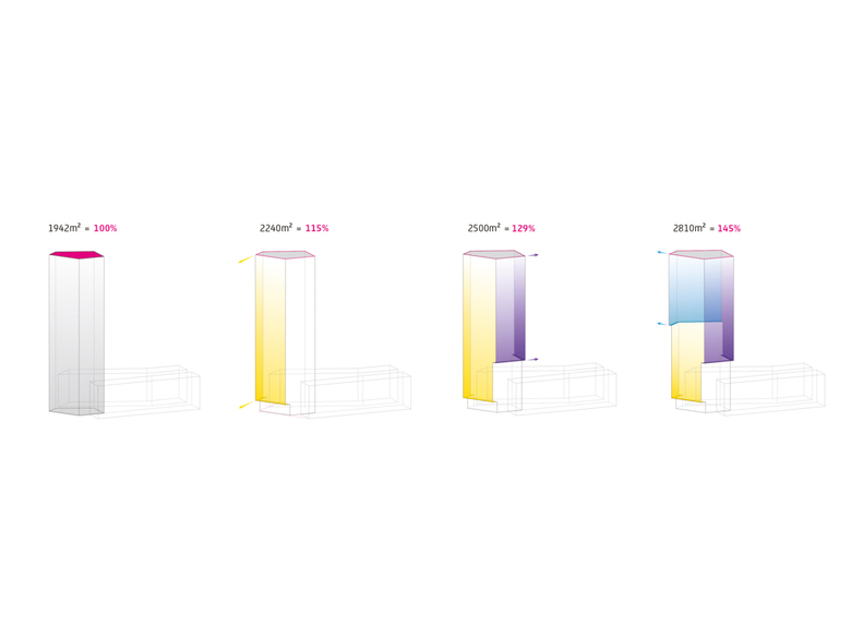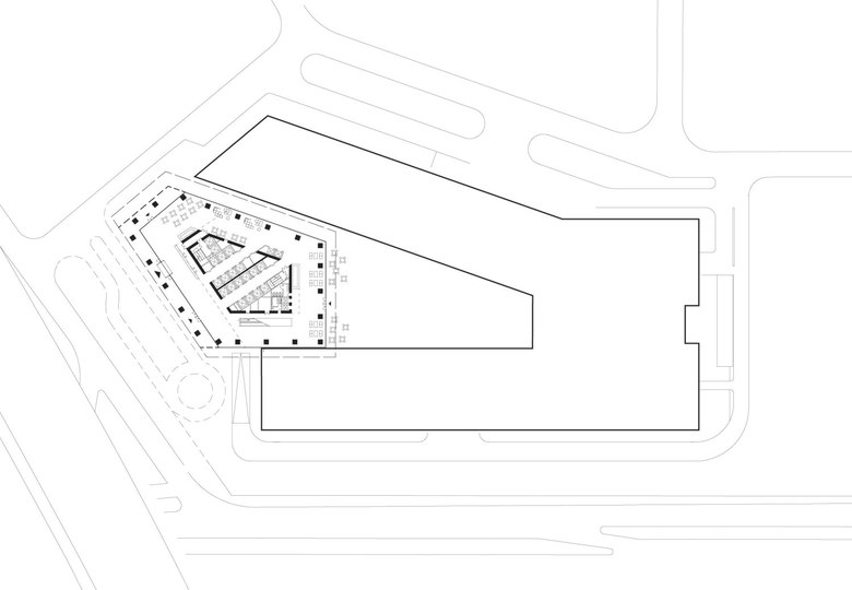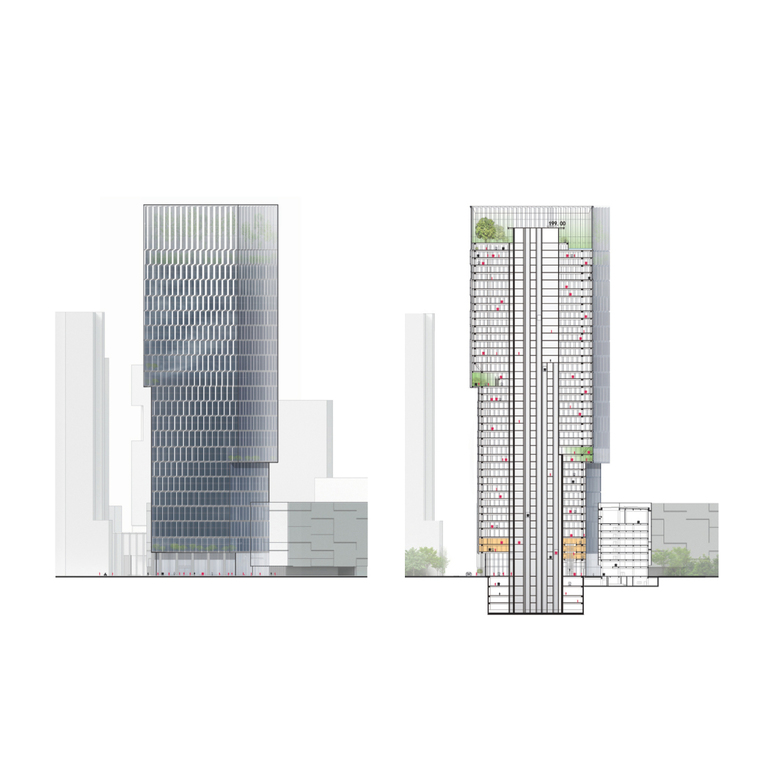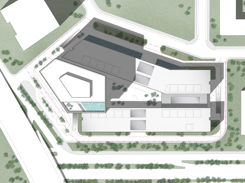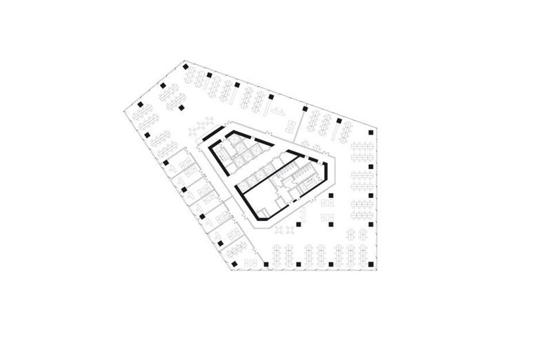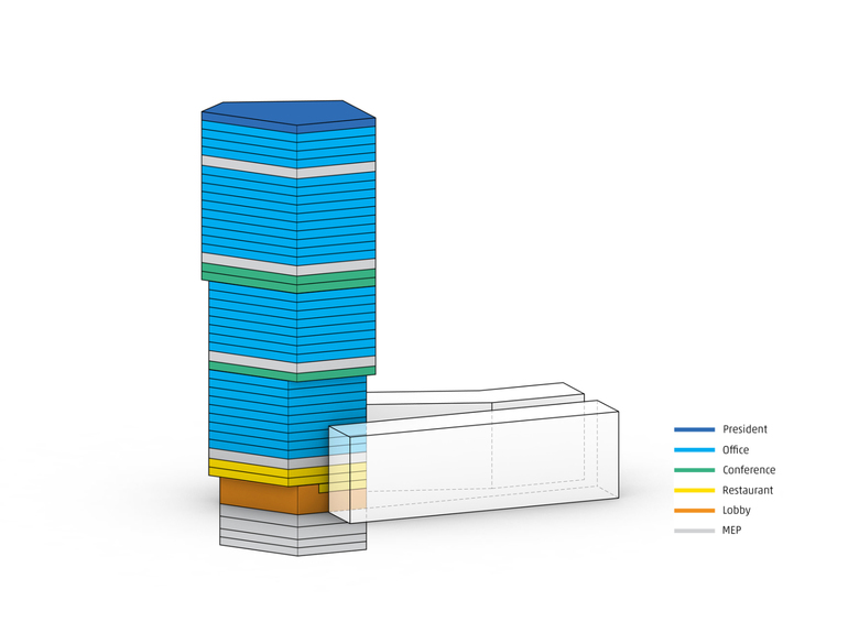 A glazed tower will form the central building for the new headquarters. The tower‘s prominent position and 44-storey height will make the building an urban design landmark. An irregular pentagon in plan, the building makes optimum use of the available ground between two existing nine-storey blocks. The high-rise will reach up to three different heights and maintain a sculptural grace, whilst allowing the conference floor levels to project out from different sides of the building. Through this multifaceted geometric form, the new tower will integrate smoothly into the existing ensemble of office blocks. The tower’s fully glazed three-storey atrium presents an open entrance. It welcomes visitors and employees into the spacious and prestigious foyer, which is also perceptible from the outside. The lifts in the central circulation core transport passengers throughout the building and between flexibly designed office areas. The tower’s column grid and reinforced concrete core, which aligns with the pentagonal layout in plan, form an effective loadbearing structure. The column grid is staggered for the technical floors, which are located beneath the conference floor projections. The façade design strikes an optimum balance between outward visibility and solar shading, whilst the pattern and the degree of transparency of the building envelope also take into account incoming solar radiation and the established room schedule. The public space, located within the projections, enjoy maximum transparency and unobstructed outward views through the generous, flat-windowed surfaces. The shape and proportion of opaque façade elements for the office storeys are a designed response to solar radiation and provide shading for interior spaces. The office areas are thereby appropriately protected from the sun in the challenging tropical urban environment.