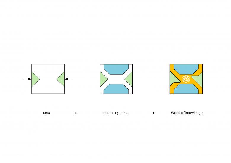 The open-plan layout of the upper stories combines laboratories and offices to create a coherent workspace. Laboratory areas are located opposite each other on two outer sides of the building. The world of knowledge unfolds in-between, including office space and shared communication areas for professional and informal exchange between employees. Glazed walls open the new build inwardly and outwardly to establish sightlines between all work areas, but also across the surrounding campus. The interiors use a subdued color scheme to instill a comfortable atmosphere. Colored glass walls emphasize the laboratory areas.