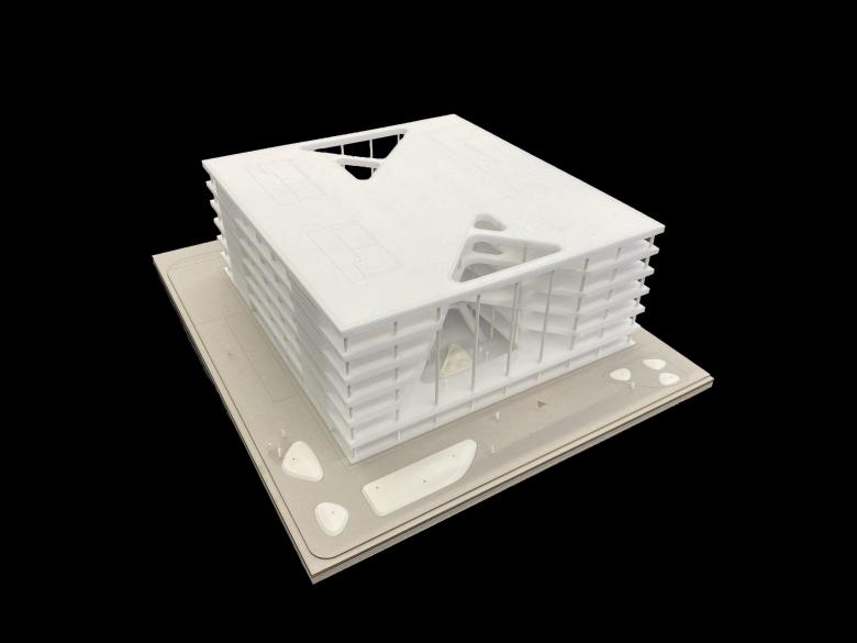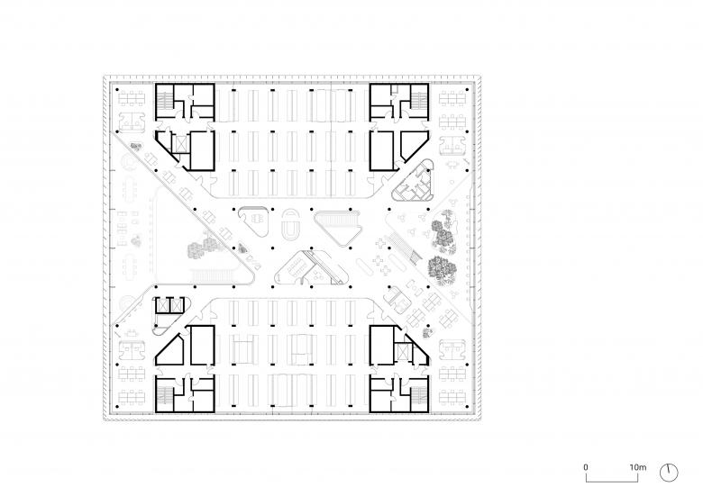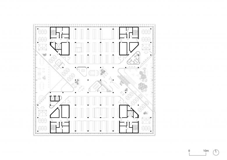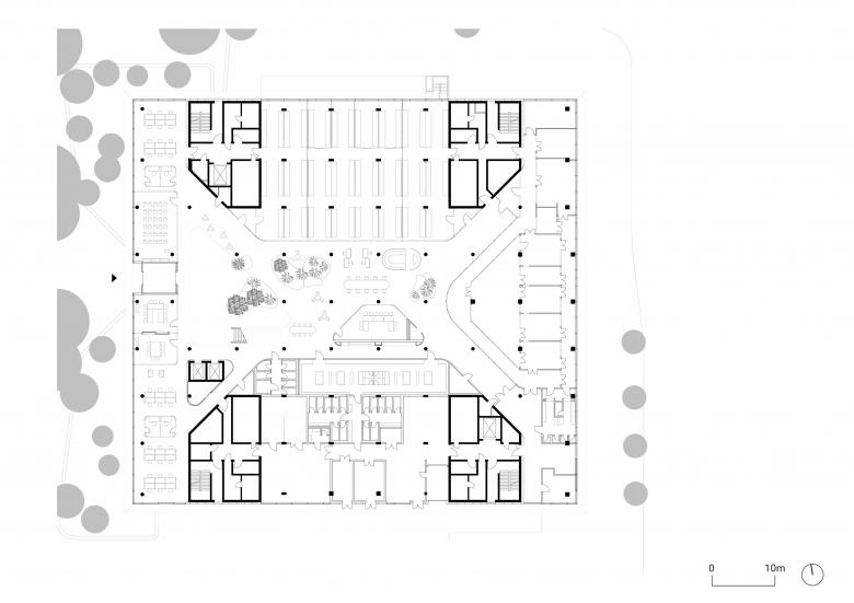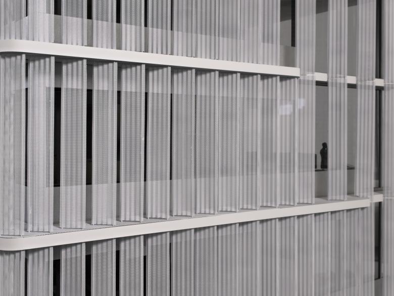 The compact cube opens to the campus and to the city through two deeply incised atria, which are enclosed by a staggered, cantilevered arrangement of the upper floors. Daylight filters through the glass ceilings of the atria into the center of the building. Various plant species from the neighboring Odenwald region, including trees up to nine meters tall, are incorporated into the building complete with their soil to transform the atria into recreational spaces. The louver structure placed in front of the glazed façade is cut open in front of the atria to offer glimpses into the interiors. Merck uses a ground-floor demonstration lab, the Technikum, to provide insights into its research work.