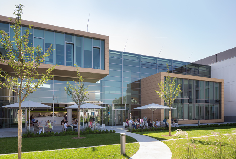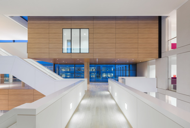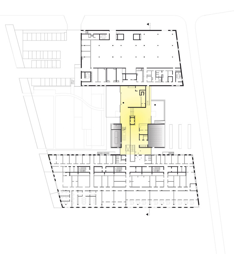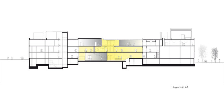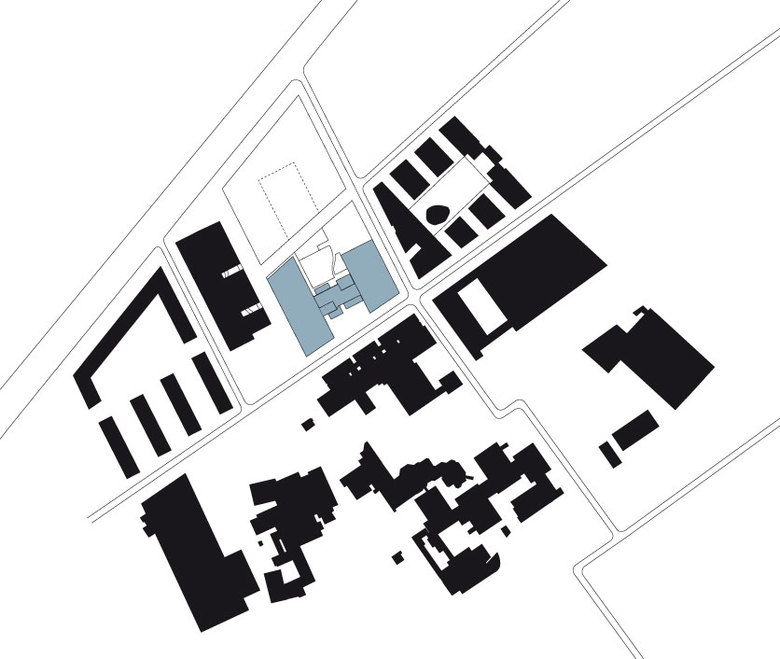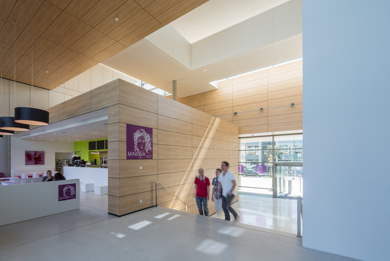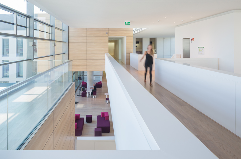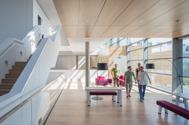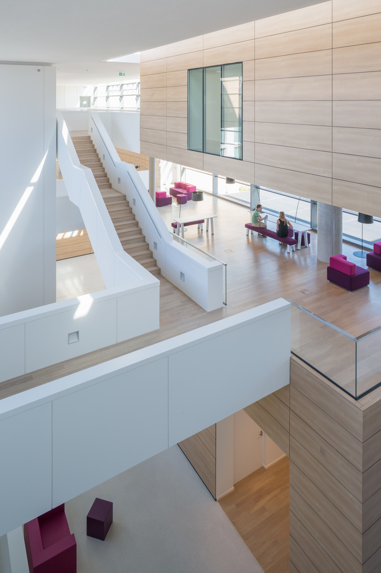 The Max Planck Institute for Brain Research is located on the Riedberg Campus in Frankfurt am Main. The complex consists of two compact buildings: the institute building and the technicum. A spacious main communication and circulation foyer with open stairs and galleries links the two units and offers opportunities for exchanges and impromptu discussions among scientists and staff. Floating boxes, which appear to push themselves out of the glass façades, provide communal meeting and presentation spaces and emphasise the interplay between interior and exterior within this semi- public zone. The four-storey institute building is separated into an office area and a highly equipped laboratory zone with flexible and divisible space for research. The two upper floors accommodate four research departments. The ground floor houses the administrative offices, the central scientific facilities and the laboratories of the independent research groups.