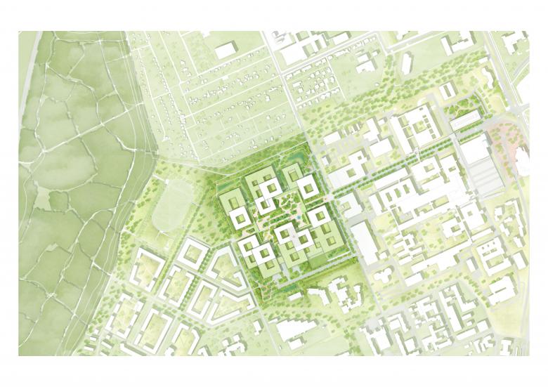 Im Osten von Hannover gelegen, ist der Campus der MHH durch den Stadtwald Eilenriede mit der Innenstadt verbunden – das Zentrum eines grünen Netzwerks, das die gesamte Stadt durchzieht. Die Campus-Erweiterung grenzt direkt an den Stadtwald an und wird mit ihren grünen, von SINAI Landschaftsarchitekten gestalteten Höfen und bepflanzten Dächern zum integrativen Teil dieses Netzwerks.