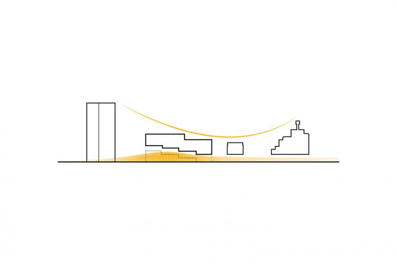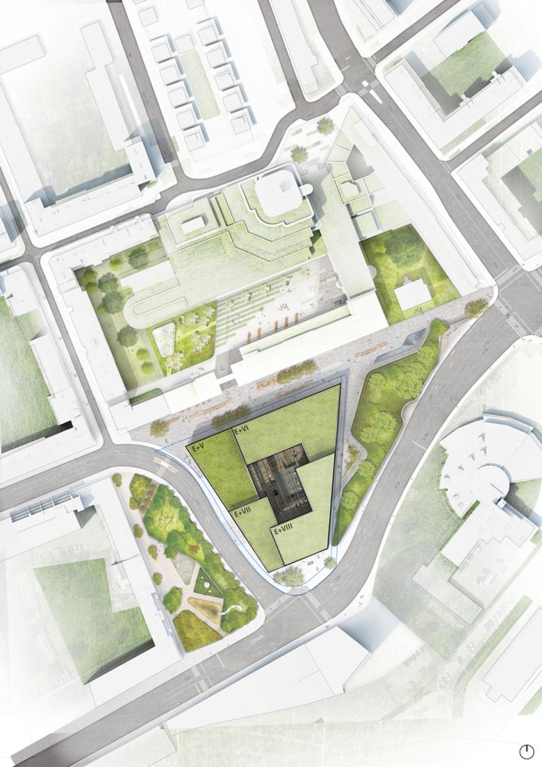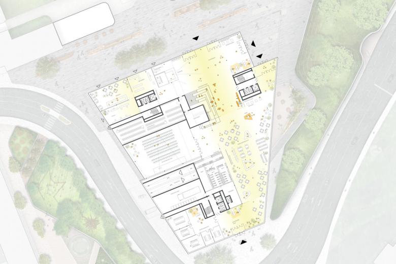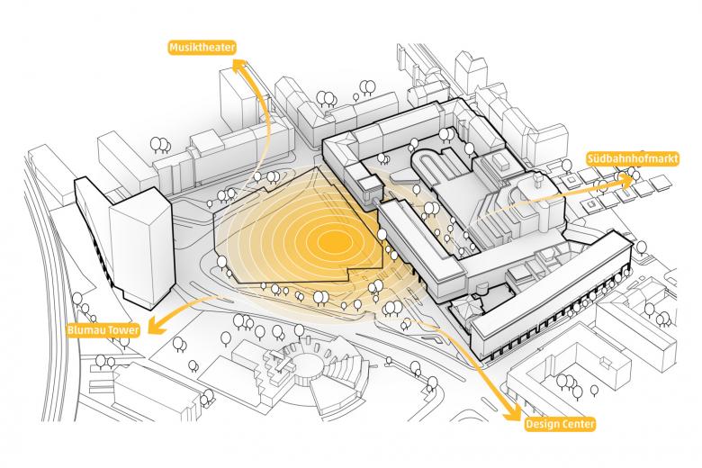 The new building for the Raiffeisenlandesbank Oberösterreich is the central cornerstone of the campus, transforming the site between the Blumau Tower and Südbahnhofmarkt into an innovative and vibrant setting. Its co-working zones, shops, restaurants and exhibition spaces provide a stimulus for businesses, while simultaneously improving the outdoor spaces for the general public.