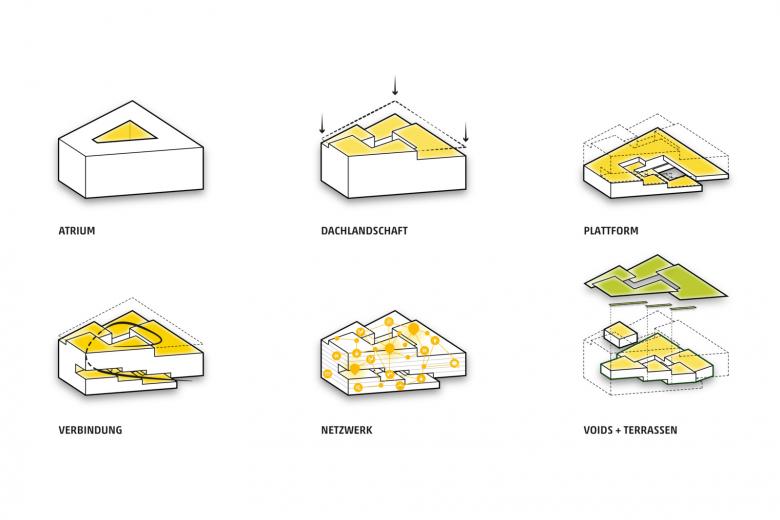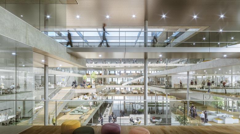 A sense of belonging and identity is generated both in the interior space and in the exterior design through its fluid transition from the urban surroundings to the atrium of the campus, which extends itself as a spatial continuum to embrace the individual working spaces and beyond to the roof terraces. The effect is that of a three-dimensional plaza, which zones the multiple floors via the large open space, gives the offices rhythm and cadence, and incorporates the whole into the neighbouring vicinity. The lower storeys fuse to form generous and flexible occupancy areas, which morph in the upper storeys to become modern office worlds.