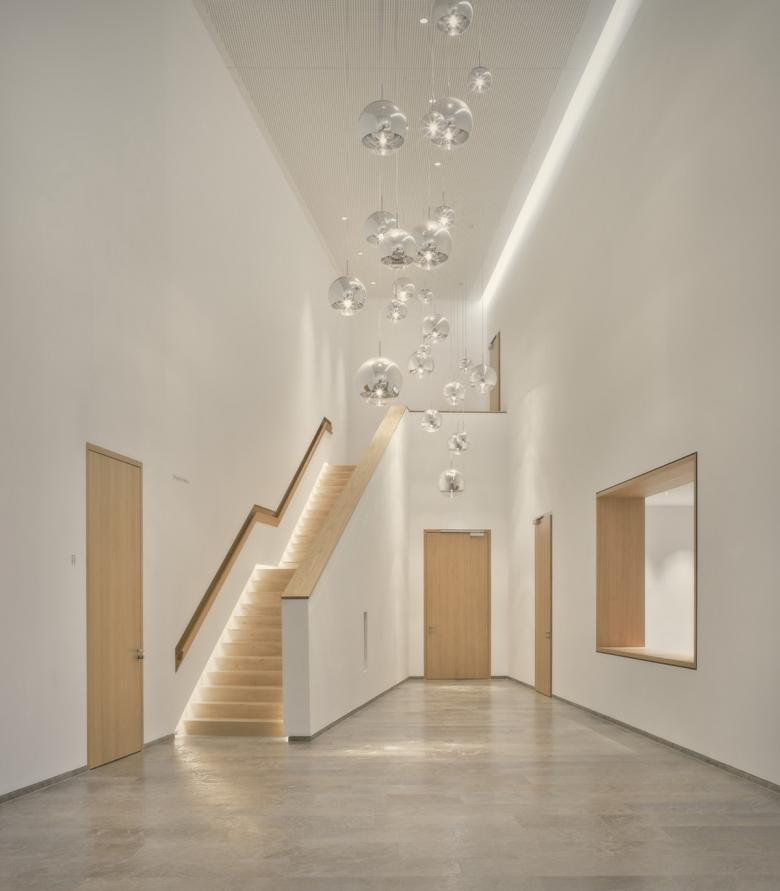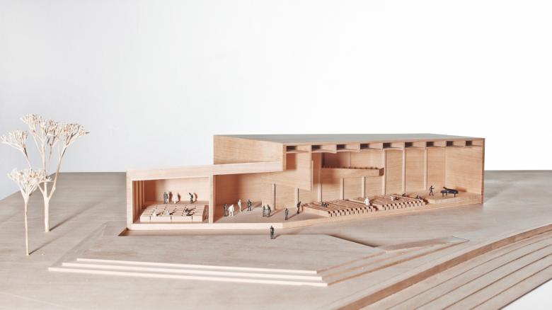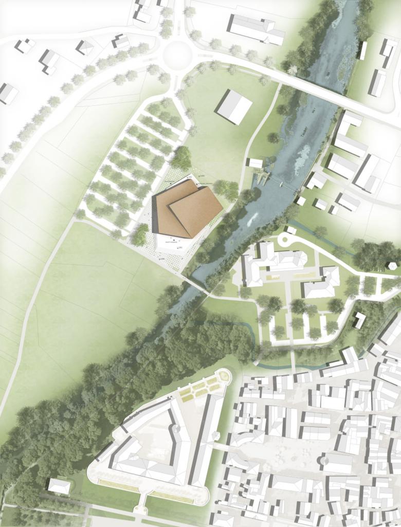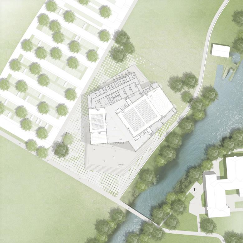The single-story building with its slightly sloping roofs is composed of two volumes: The larger of them houses the grand concert hall whose trapezoidal stage, inclined wall panels and reflective ceiling elements provide excellent acoustics. Depending on the requirements, this hall can be used for multiple purposes thanks to its flexible seating, including concerts, film screenings, congresses, exhibitions, or school and club anniversaries. Its rear can be opened to the lobby so as to create a venue for large events. The lower part of the building accommodates the small concert hall, which can be divided into two even smaller units or also opened up to the lobby. In the southeast corner, a deep cut into the façade marks the main entrance. The lobby’s extensive glazed front opens up invitingly to the forecourt with a terrace in front.