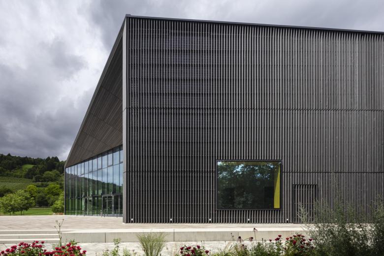Its sculptural shape and sharp edges make the new concert hall stand out from the surrounding hilly landscape. Like the wooden corpus of a musical instrument, the outer shell of the building is made of wood. In the lobby, the floor is covered with natural stone – a shell limestone sourced from regional quarries. Geothermal collectors have been installed near the banks of the adjacent Tauber River to extract heat or cold from the groundwater, depending on the season. This system supplies about two-thirds of the energy the building consumes.