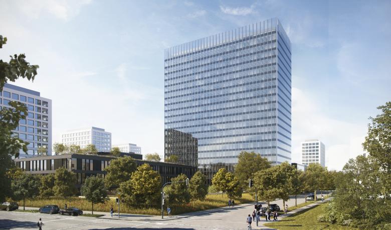The decision to conserve and repurpose the existing concrete tower, leaving the cores and structures untouched wherever possible, saves over 5,000 tons of carbon. The original façade has to be replaced to increase the energy efficiency of the building. The new façade references the original pattern, facilitates sun shading between two glass layers while maintaining the intake of fresh air from outside. The building will be powered by geothermal and solar energy, with 3,000 square meters of photovoltaics integrated in the tower’s façade and along the roof edges of the south building. The top of the southern building will be covered in green, contributing to the biodiversity on the site.