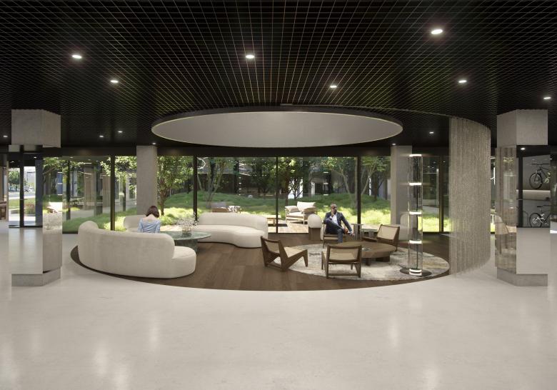 The high-rise building offers structurally suitable grids for standard office spaces as well as more flexible co-working environments. Up to four rental units per floor can be served by the two central access cores. Across all three buildings, the ground floor is open to the public, connecting THE SOURCE with its urban environment, a mixed quarter with residential buildings for students and senior citizens that integrate within a blooming urban infrastructure. The northern building will function as the main entrance to the complex, while the southern building is embedded in dense greenery. A sunken courtyard is designed as a terraced playscape for the daycare center.