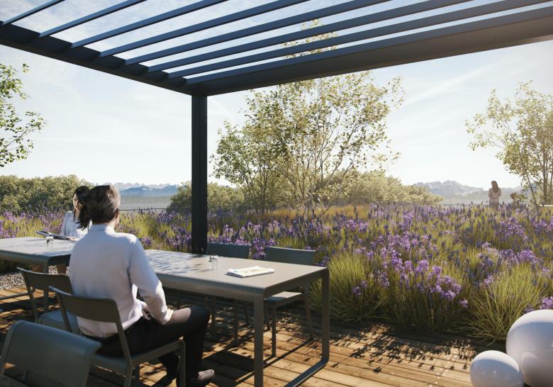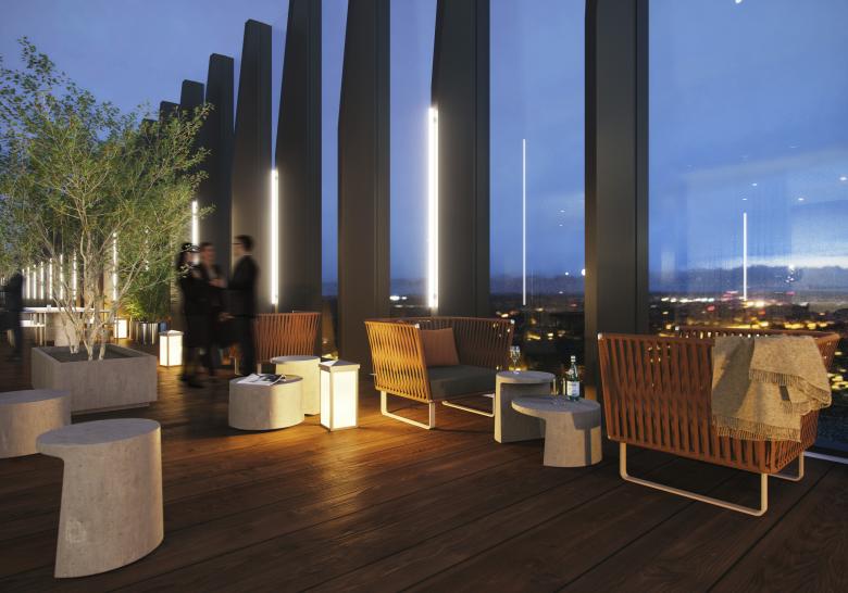 The orientation of the high-rise tower – facing north with views of the city and south with sweeping vistas of the Alps – has been reflected in the interior concept: focus zones toward the south overlooking nature, and more active, open working zones on the northern side toward the city. The sky lounge at the top of the building will include a café and terrace open to all users of the building.