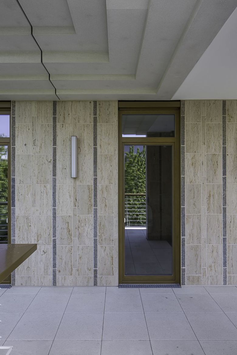 The facades enter relationship to the surrounding buildings, in a regular rhythm of light coloured columns and contrasting windows. Instead of using metal and glass as used on the other edifices on the site, we chose natural stone. This material on the one hand takes account of the particularity of having a modern office and residential building in this area characterised by administrative buildings from the sixties. At the same time the stone used and the particularities of the technique used to lay it are reminiscent of Sep Ruf, and the reconstruction period of Munich. Around the columns, dark shell limestone and light travertine create an attractive pattern, which in its small-scale fragmented arrangement purposely avoids any association to massive stone. As a continuation of the slabs on the columns, the walls behind the balconies and those at ground floor level are similarly veneered with natural stone. The remaining wall areas have a smooth render, which matches the natural stone slabs.