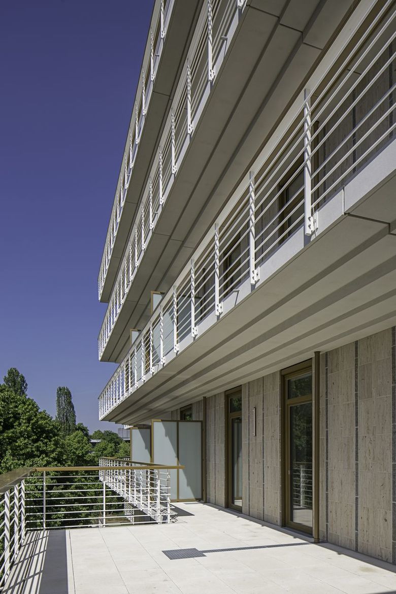 Andreas Hild, Dionys Ottl and Matthias Haber would like to see their design as homage to the site itself. The new buildings’ precast concrete skeleton construction follows the design of the surrounding structures, seen for example in the staggered terraces of the residential building. Generous balconies skirt the edifice, and together with the terraces of the office building create attractive open spaces. The balconies of the residential building are made of profiled prefabricated elements of artificial stone and correspond to the ceiling disks of the office building. The slim metal guardrails underline once again the arrangement of the buildings and the transparent appearance created through the architectural context.