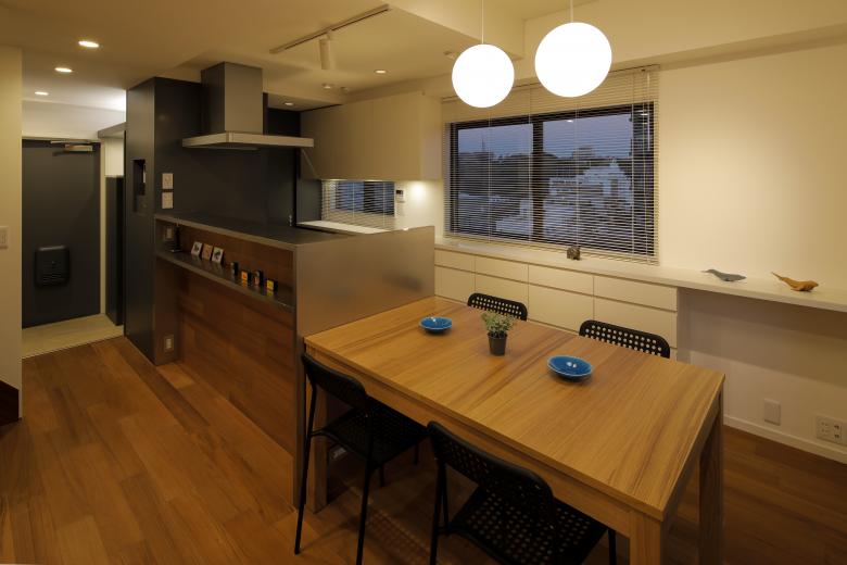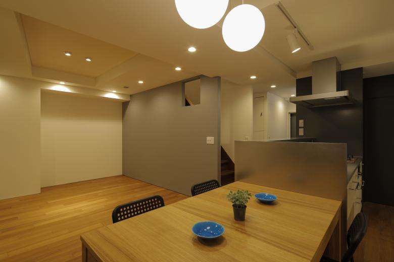 The wandering line that goes from the entrance on the lower floor to the island kitchen via the backyard is the essence of this house along with the mechanism of the flexible partition.