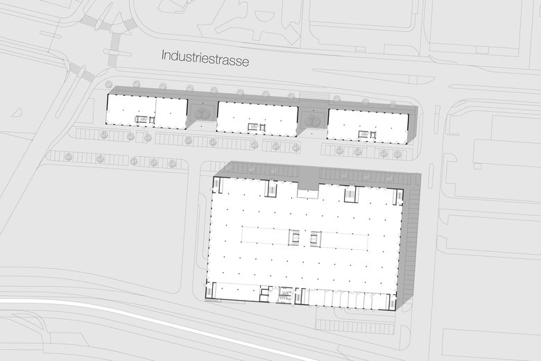 Zwei breite Durchbrüche lassen sequentielle Einblicke in die alleeartige Erschliessungsstrasse, welche parallel zur Industriestrasse verläuft. Die Erdgeschossnutzung wird durch geeignete Verkaufslokalitäten und Restaurationen gefüllt. Das Obergeschoss soll durch kleinere Office-Zonen im Dienstleistungssektor genutzt werden. Lager und Technikräume