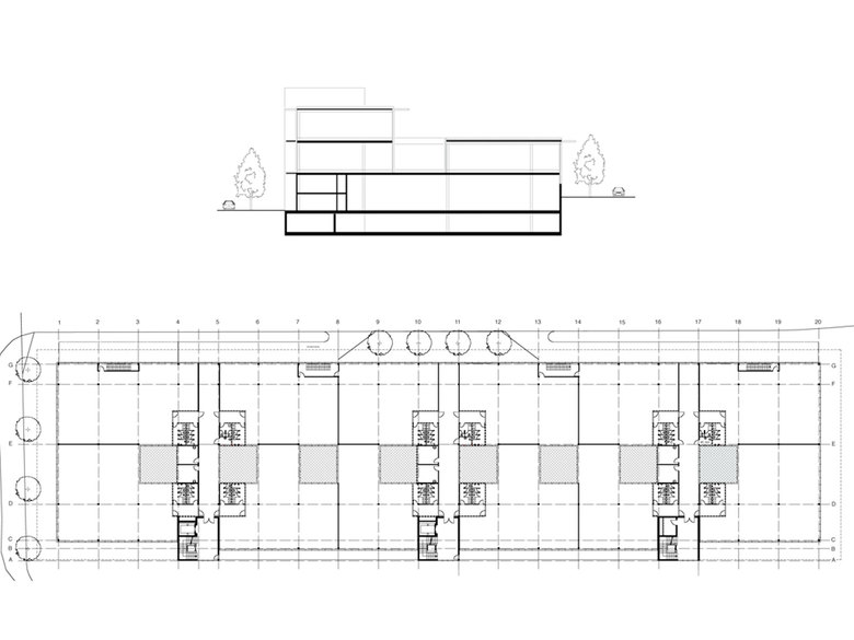 Das moderne Gewerbehaus beim Einkaufszentrum Volkiland ist als Dienstleistungszentrum mit ca. 4'500 m2 Verkaufsfläche sowie 5'500 m2 Bürozonen konzipiert. Das Untergeschoss,welches als massiver Sockel in Ortbeton ausgeführt wird, ist eine schwimmende Plattform aus welchem drei brachiale, in schwarzem Beton aufstrebende Treppentürme wachsen. Diese fungieren als Ankerpunkte für das leichte, transparente Hauptvolumen.