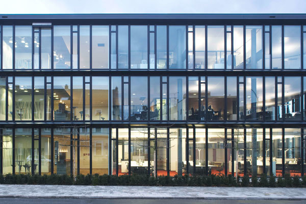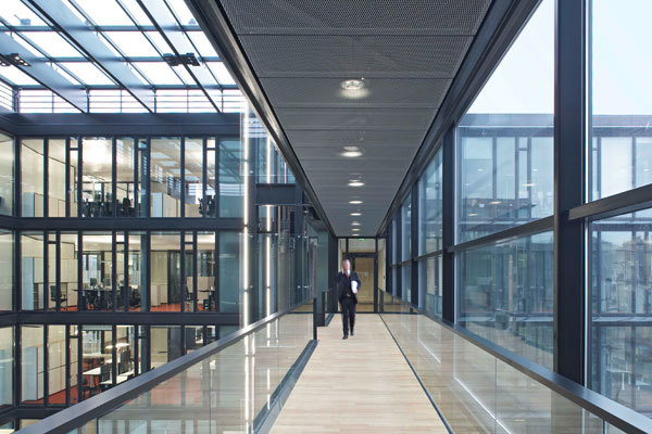 The ultimate result of these basic ideas is a meandering glass building divided into sections along its length by four glass atria. From an urban development standpoint, the new building consolidates the formerly commercial use of the grounds and, with its varying height, mediates between the different heights of the surrounding structures and the grounds themselves. The open, green-surfaced courtyards and the setbacks from the building line generate a stimulating street layout, which breaks up and expands the road space.