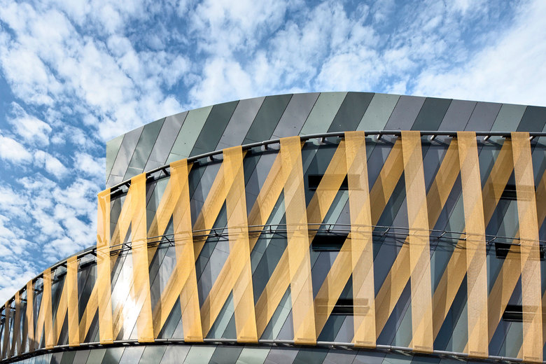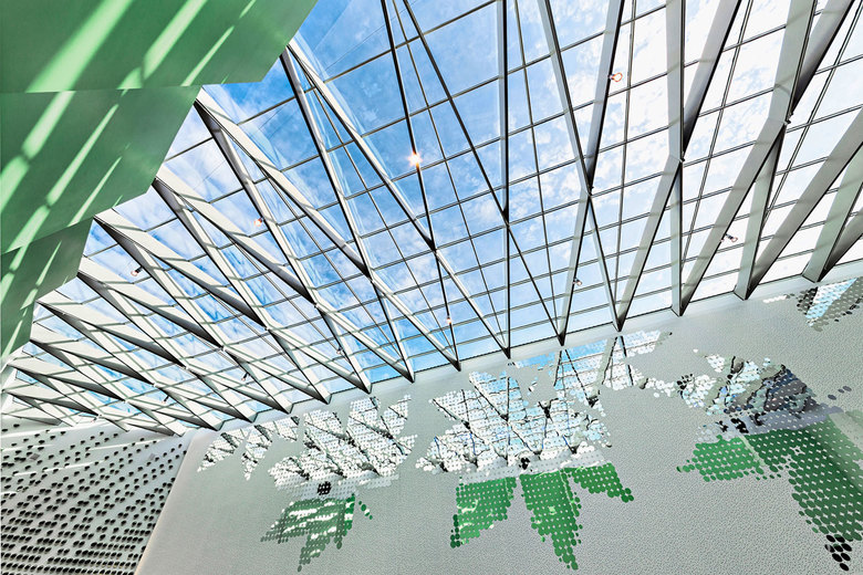 Der als komplexes Polygon ausgeführte Baukörper wird oberhalb eines Sockels von einer Metallgewebefassade umspannt und nimmt so das Thema Industrie motivisch auf. Werner Sübai, HPP-Gesellschafter und verantwortlicher Partner, über das Fassadenkonzept: „Den Bezug zur Umgebung stellen geflochtene, metallene Gewebebänder her, die an die industrielle Tradition Solingens erinnern.“ Im Bereich des Sockels öffnet sich der Baukörper durch großzügige Verglasungen der Verkaufs- und Gastronomieflächen hin zum städtischen Platz. Gebäudehohe Rücksprünge in der Fassade akzentuieren unverkennbar die beiden Haupteingänge am Graf-Wilhelm-Platz und an der Kölner Straße. Durch Begrünungen in der Fassadengestaltung, die einen weichen Kontrast im ansonsten kristallinen Erscheinungsbild erzeugen, wird zudem ein thematischer Bezug zu der umgebenden Landschaft des Bergischen Landes geschaffen. Auch im Inneren sorgen Gestaltungselemente mit Naturbezug für eine hohe Aufenthaltsqualität. Beispielgebend dafür ist die durch ein Skylight belichtete, grün gehaltene Main Mall.