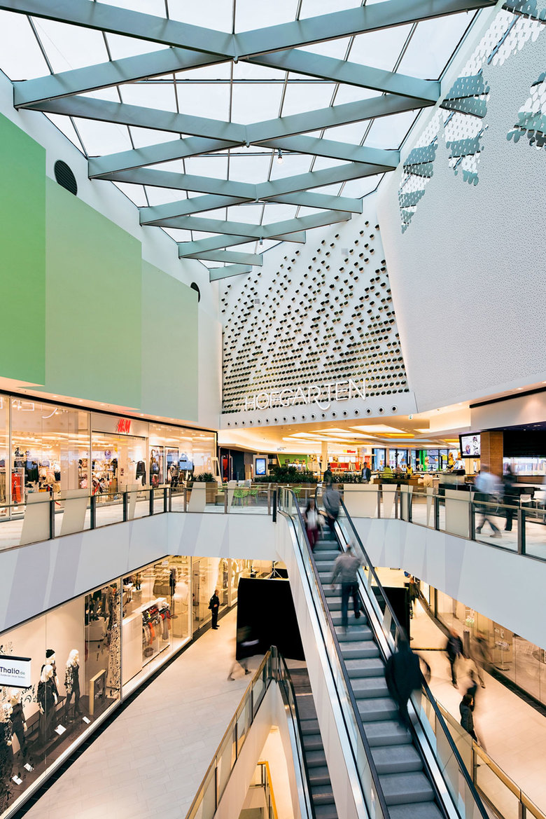 Das Einkaufszentrum erstreckt sich über acht Geschosse; das Parkhaus mit 600 Stellplätzen ist dabei in drei der insgesamt vier Untergeschosse integriert. Auf drei Etagen befinden sich rund 86 Mieteinheiten, die sowohl Einzelhandel, Dienstleistungen und Gastronomie auf einer Bruttofläche von 29.000 Quadratmetern aufweisen. Neben H&M, Spiele Max, dm-drogeriemarkt, Edeka und TK Maxx ist Saturn einer der Ankermieter im neuen Hofgarten.