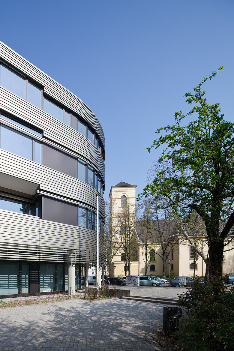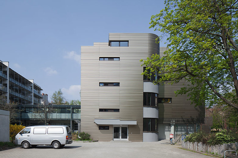 Horizontally layered U-shaped aluminium slats with varying heights between 5 and 11 cm, anodised in light bronze concrete, emphasise the surrounding dynamics of the strongly modelled building volume. The U - elements interlock in an irregular rhythm, so that a varied rhythm is created within the surfaces. The external sun protection is integrated behind the metal elements. A strip of façade running in front of the windows reminds us of the old position of the sun protection.
