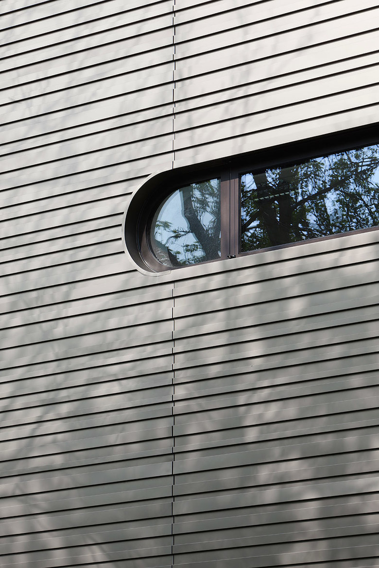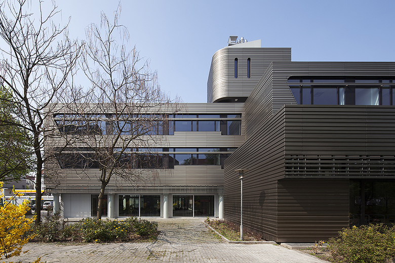 The underlying window level with large-format elements in dark bronze concrete, cut into the metal facade as a band facade, increases the dynamics of the facade. In the area of the supports, the highly insulated block windows are replaced by flat facing panels. Ventilation is provided by the narrow side window elements and skylights, the large wings are opened for cleaning purposes.