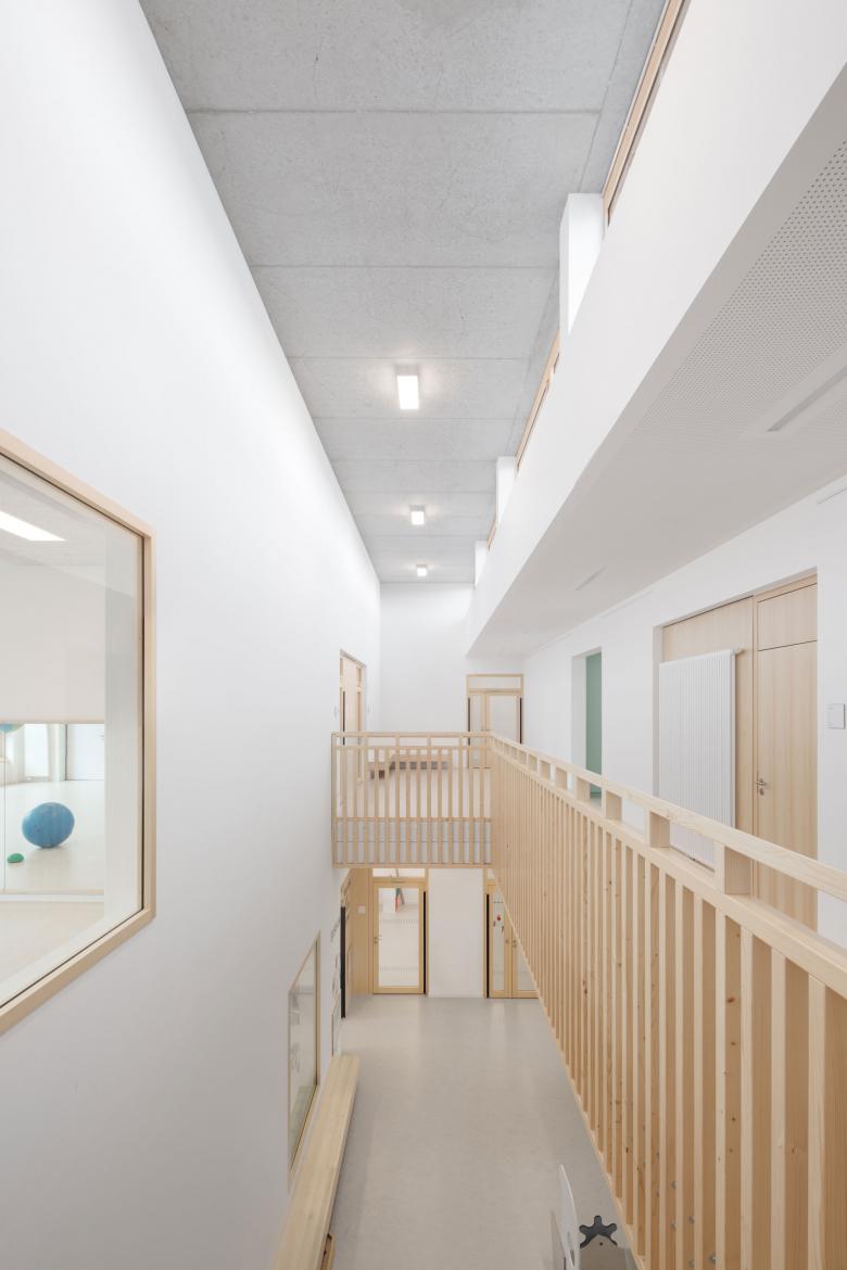 The new Kindertagesstätte offers bright, light-flooded rooms for 2 groups of 50 children divided on 2 levels. A small arcade to the central "forum" forms a weather-protected entrance area and opens into a compact porch. From here, a double-flight staircase connects the upper floor. Directly opposite the entrance door is the access to the group rooms on the ground floor.