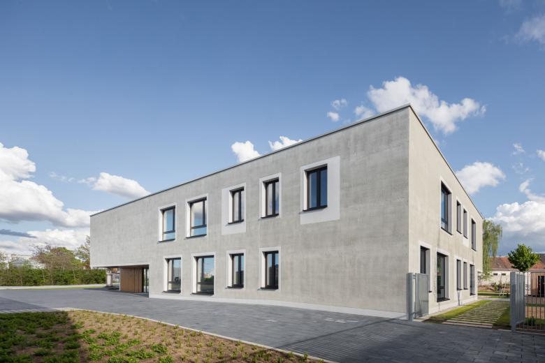Comb plaster in a silver-grey shade. The load-bearing inner walls are made of 24cm thick Poroton bricks and the non-load-bearing inner walls of 17.5cm thick Poroton bricks and provided with an inner plaster. Another advantage of the solid construction is above all the storage capacity of the walls, which plays a major role in the cooling of the building, especially in summer heat insulation. On the ground floor, the cut-in entrance areas are accentuated with a wooden cladding of larch slats. The windows are made of wood-aluminium construction. An external sun protection protects the classrooms from summer overheating.