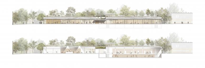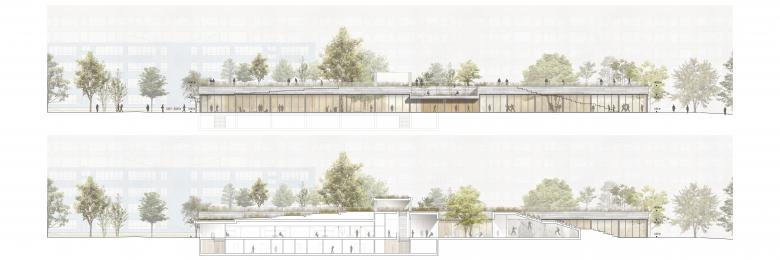 The playable green roof promotes the integration of the large building mass into the central park of the large housing estate, and the citizens are additionally provided with the built-up area as an usable parking area. The roof garden gains additional quality through the wide views over the Nuthetal. The building thus makes an important contribution to improving the identification of all users with the housing estate. In the proposed extension of the Nutheweg, a bridge over the Nuthe even provides a connection to the Babelsberg district.