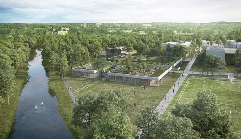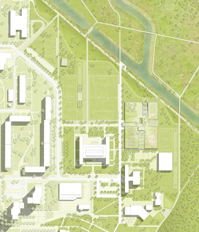 The large housing estate 'Am Schlaatz' in the southeast of Potsdam was built in the 1980s for around 15,000 inhabitants. The Nuthe, a tributary of the river Havel, borders the district to the north-east. In interaction with the course of the Nuthe, the development frames an inland area are intended for public functions, with the Nuthepark as a forum for social infrastructure. This contains district centres, schools, kindergartens, an integration garden and extensive sports areas. In this interplay, the new sports forum assumes central tasks of upgrading the 'Socially Integrative City' and individual leisure activities.