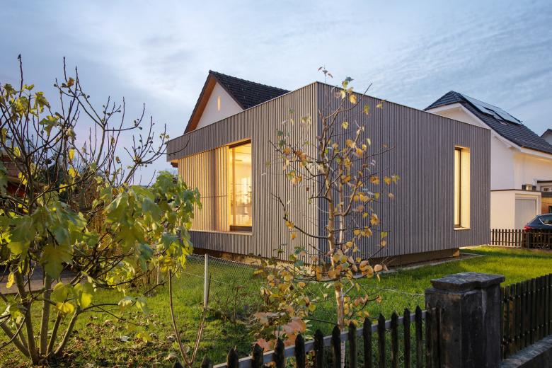 Ein filigraner Holzfilter verschafft der Terrasse eine erhöhte Privatsphäre, indem er den Blick von der Straße sanft abschirmt. Zugleich setzt er einen gestalterischen Akzent, der die Ästhetik der Holzfassade bereichert.