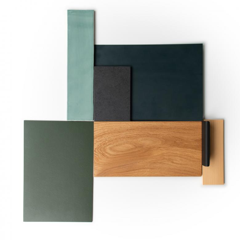- Dunkelgrün, warm anmutende Belegung der Küchenfronten