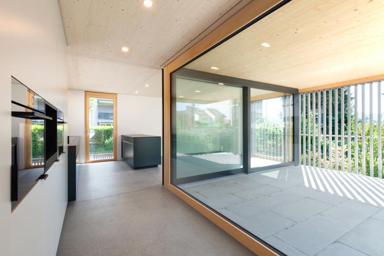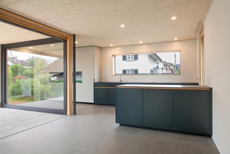 Der Anbau fügt sich harmonisch an das bestehende Haus und beherbergt eine lichtdurchflutete Wohnküche. Von dort führt der Weg direkt auf die grosszügige, einladende Terrasse.
