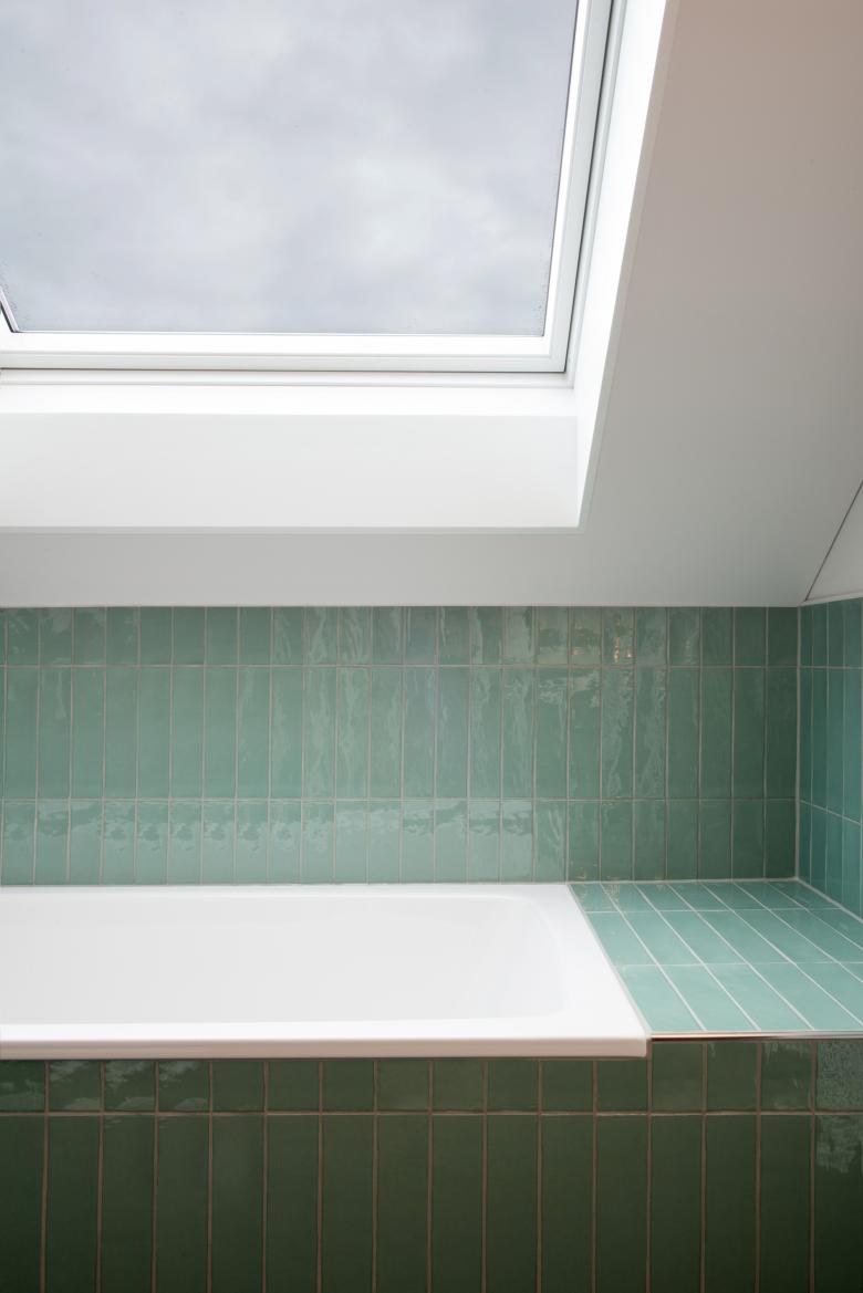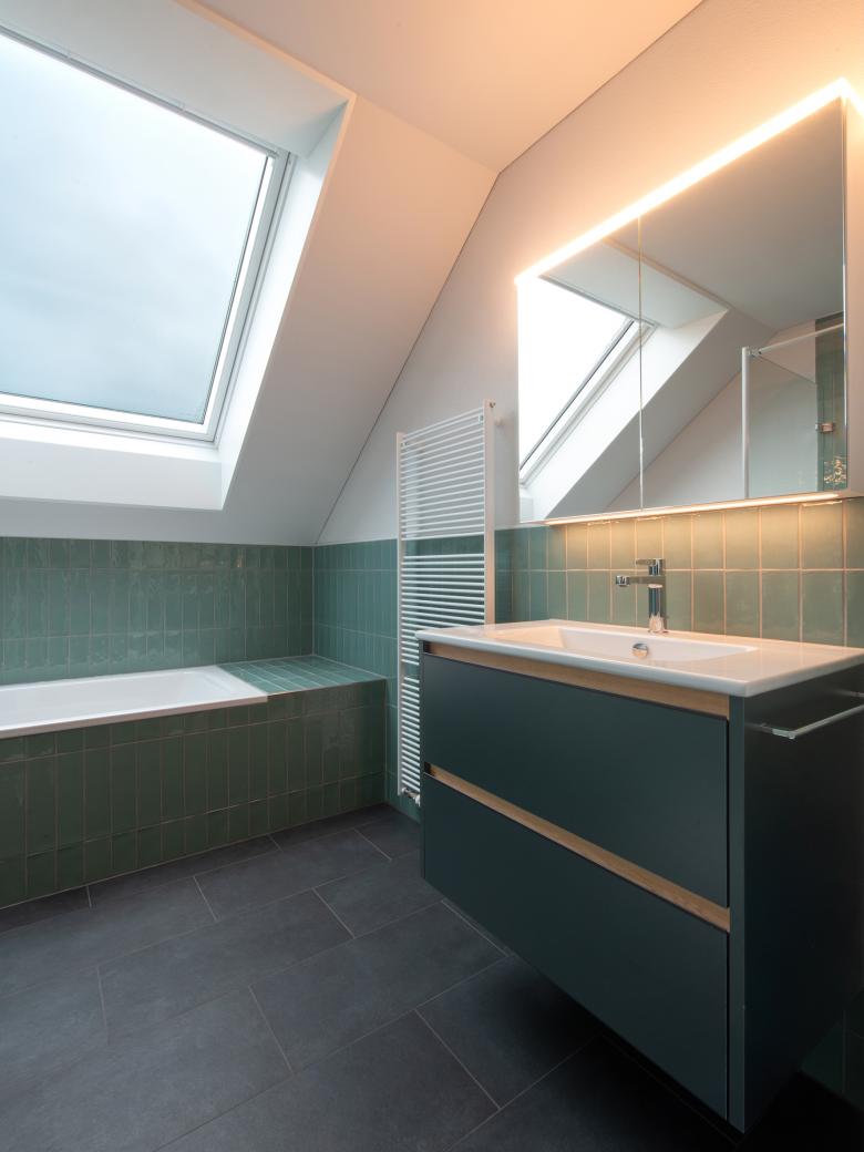 Das zuvor hauptsächlich als Estrich genutzte Dachgeschoss wurde vollständig umgestaltet. Ergänzt wurde es unter anderem durch ein geräumiges Bad, das stilvoll das Farbkonzept der Wohnküche aufnimmt und mit eleganten Wandplatten weiterführt.