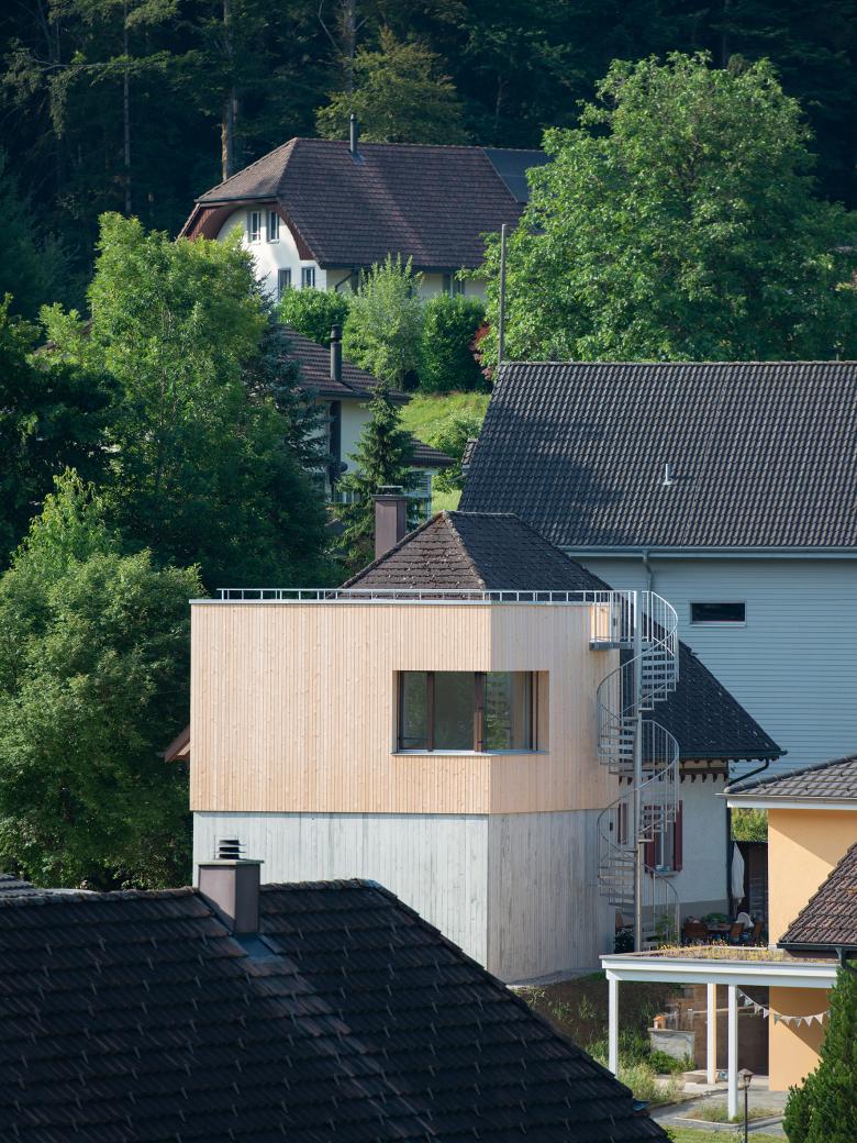 Expliziter Wunsch der Bauherrschaft war es, das Dach des Anbaus als Terrasse zu nutzen. Diese bietet einen wunderschönen Blick in den Solothurner Jura und ist über eine Wendeltreppe im Westen erschlossen.