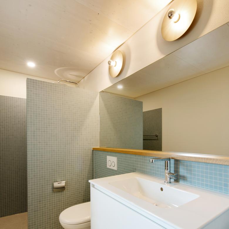 Im Anbau befinden sich im Erdgeschoss neben dem Entrée eine Garage und ein Badezimmer mit Dusche. Im 1. Obergeschoss des Anbaus ist das grosszügig gestaltete Schlafzimmer untergebracht. Die offen konzipierte Ankleide schliesst hier direkt an den Schlafbereich an. Vom Schlafbereich öffnet sich der Blick ebenfalls nach Westen in Richtung der Hügelkette des Jura.