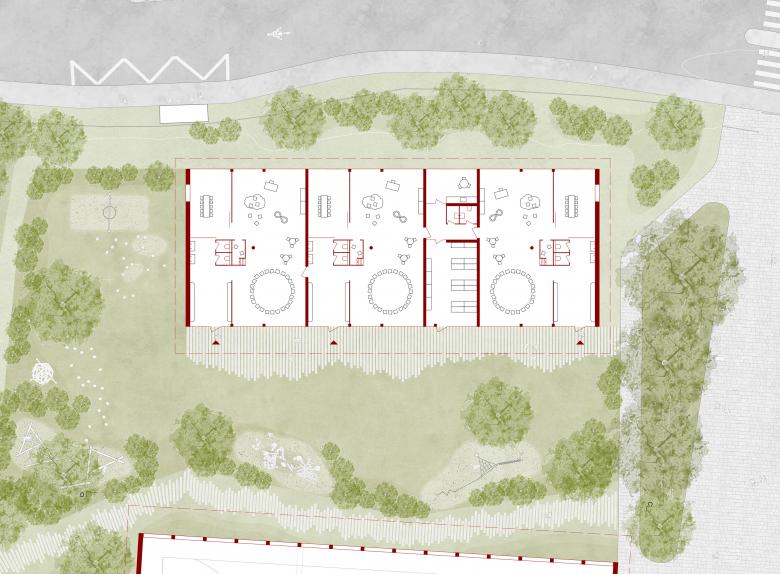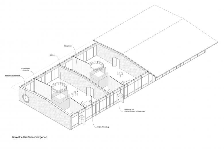 Die als Cluster organisierte Tagesstruktur ist im Erdgeschoss des Gemeindesaals gut erreichbar und attraktiv mit dem Aussenraum verbunden.