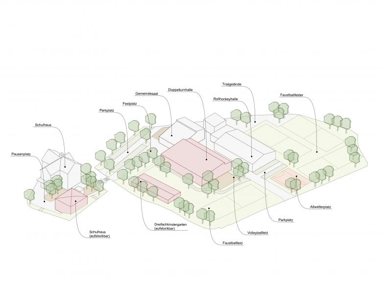 Das neue Schulhaus steht als Punktbau zwischen Kirchpark und dem Pausenplatz. Der Kindergarten rückt an die Hauptstrasse heran und trennt zur Doppelturnhalle einen ruhigen und gut besonnten Kindergartenhof ab. Der Gemeindesaal bleibt erhalten und die neue Doppelturnhalle ersetzt die bestehende Turnhalle eins zu eins.