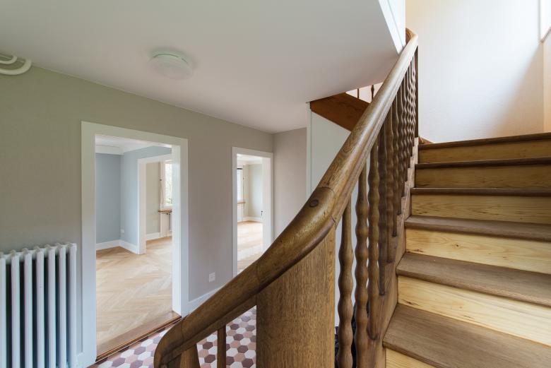 Neue Bodenbeläge ein Fischgrätparkett in Eiche und farbige Keramikplatten, stellen einen zeitgemässen Bezug zur Bauzeit des Bürgerhauses her und ersetzen den alten Teppichbelag. Neue Wanddurchbrüche schaffen Grosszügigkeit zwischen Küche, Wohn- und Essbereich. Die neue anthrazite Küche setzt im Haus den modernen Akzent.