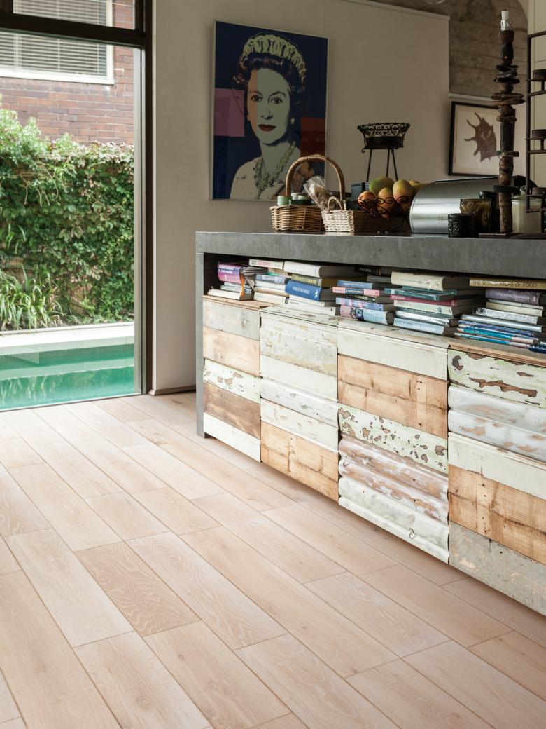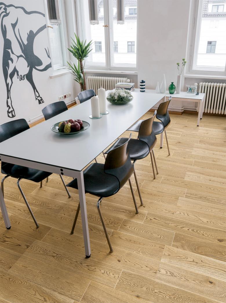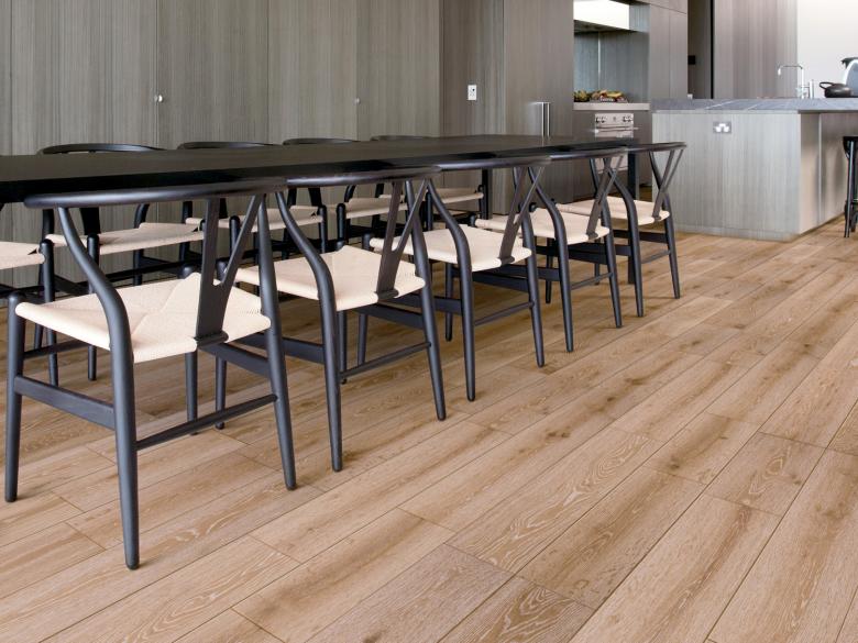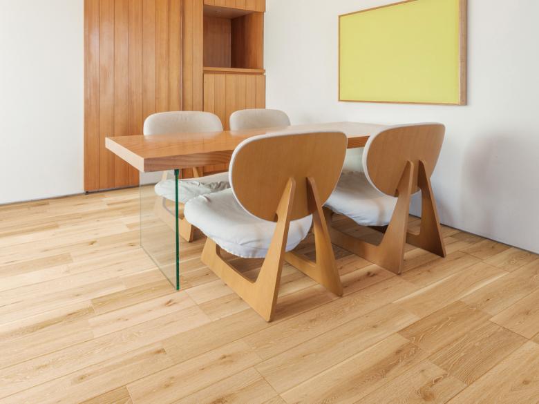 A rough-planed finish comes together with a pattern that highlights the grain of two-millimeter-thick natural oak veneer and a matte surface similar to that produced by oil finishes. By amplifying the characteristics of real wood, this flooring offers plenty of natural appeal.
