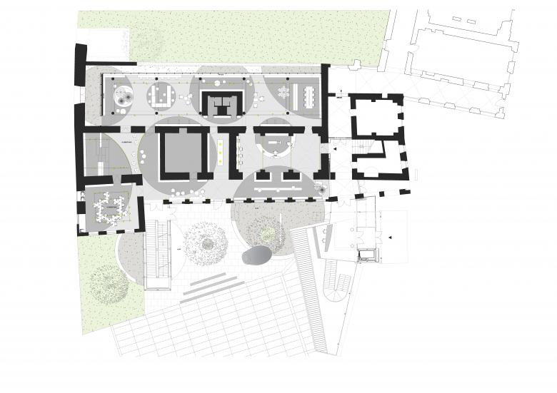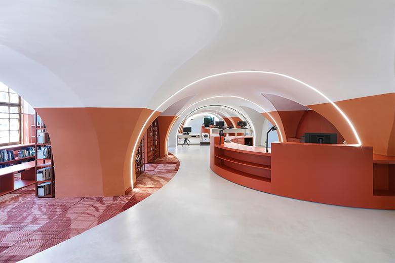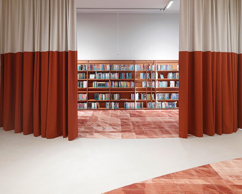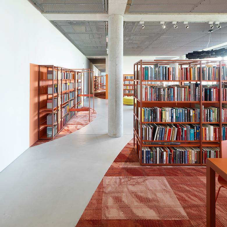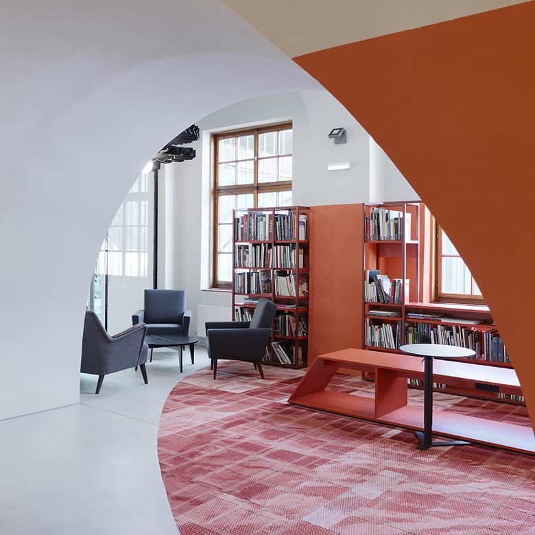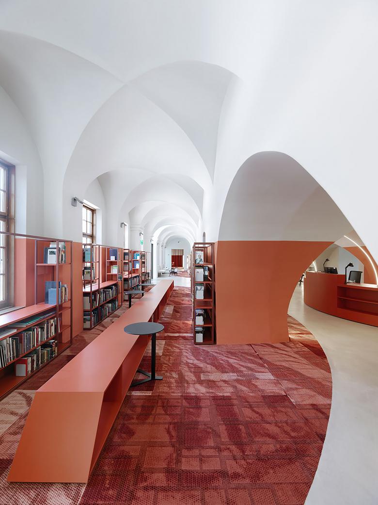 The element of the circle is the conceptual link between the heterogenous parts of the existing museum building, a historic convent structure with an extension by Günther Domenig. A colored band of modular shelves extends the flooring´s raster into the third dimension, creating a spacial framework.