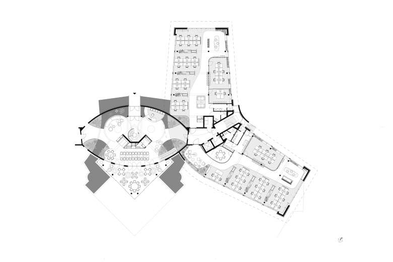 One fascinating challenge in this project was to completely transform a building without interfering in the existing structure in any way. A fundamentally different atmosphere was achieved by changing the ceiling landscape. The existing panels were allowed to stay, but these were supplemented by coloured strips. In place of grey metal ceilings, colour gradients create a new spatial depth and a considerably improved mental balance. Blue is a calming colour – and also promotes creativity. A gradual progression into white brings additional openness and lightness to the space. Workways have been kept neutral to promote concentration. The pale pink walkways are genuine mood boosters and, incidentally, increase empathy amongst employees. Thoughtfully placed water sources and tasteful lighting help bring about an even better mood. Tropical wallpaper meets soft shapes and round tables. And the nudge insight that central Europeans only feel part of a group of up to 24 people was taken into account in every zone. Despite this, much more space for communication has been created overall – which was an explicit wish of the employees, but also a requirement of a changing work culture in which information exchange and a sense of cohesion and belonging play an increasingly important role. The only exception is an impressive vestibule that puts many a hotel lobby firmly in the shade. And the new café on the upper floor provides an atmosphere in which to refuel and hatch out fresh ideas.