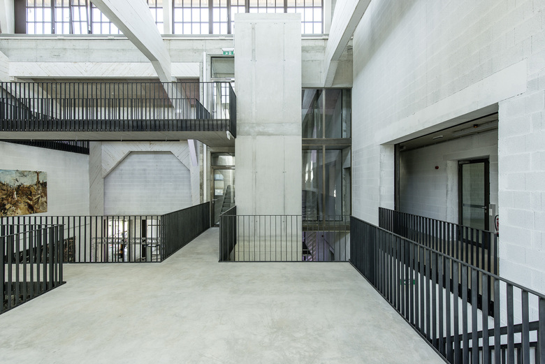 About three quarters of the nearly 200 metres long and 50 metres wide hall were retained. For the purpose of the refurbishment it was subdivided into sections B, C and D, for which three architects' practices have been commissioned: hobby a. and strobl architects from Salzburg, and LP architecture from Altenmarkt. On the site of the demolished quarter of the building a six-storey office tower was built to a design by architect Christoph Scheithauer, Salzburg; this completes the cluster for creatives, catering and medical practices.