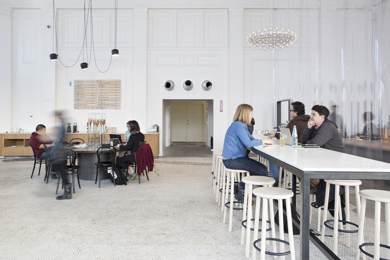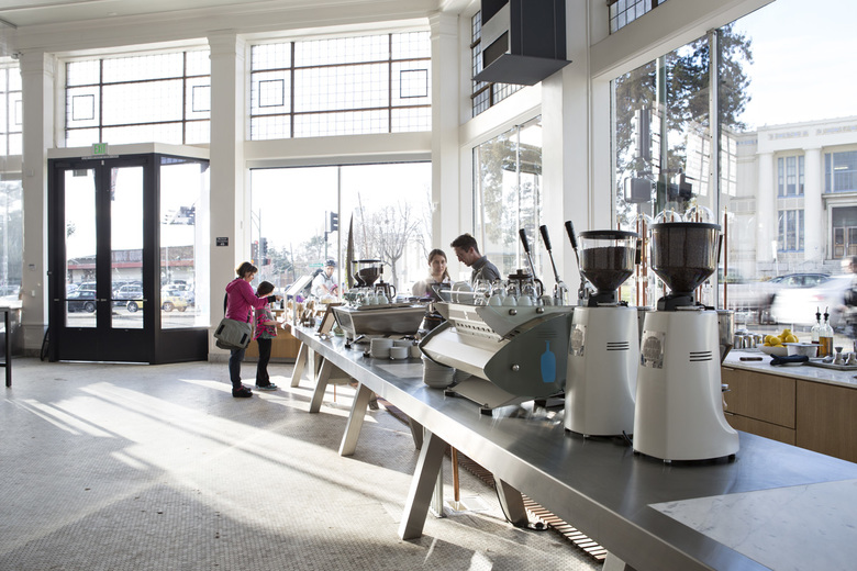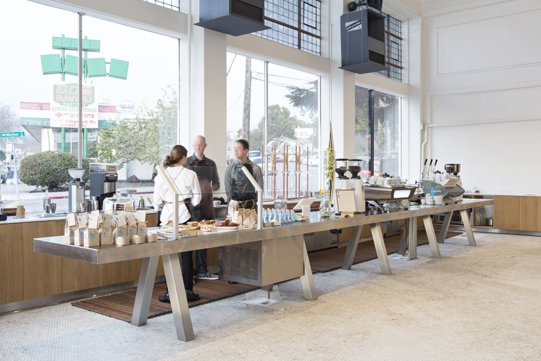 Located in an historic 1921 former auto showroom in Oakland, this flagship location for Blue Bottle Coffee expresses the company’s guiding principals through its design. The focal point is an espresso bar on a custom 30’ long stainless steel table. Inside you’ll find seating, retail area with coffee equipment and espresso machine sales, and the company’s tech department, which repairs professional and residential espresso machines behind a clear vinyl curtain. Inside, the architectural approach was to respect and preserve the existing qualities of the former showroom, while inserting new large scale fixture elements.