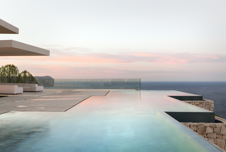 Un conjunto de muros de hormigón blanco se disparan en diferentes direcciones, comprimiendo y expandiendo las visuales, generando múltiples escenas. Los planos verticales quedan acotados por largos voladizos horizontales que se extienden buscando el mar, generando porches que delimitan el extenso espacio de la terraza. Por su sistema constructivo, los voladizos no se apoyan en los muros, sino que se encajan entre ellos, aumentando la tensión visual y creando sensaciones contradictorias entre masividad y liviandad.