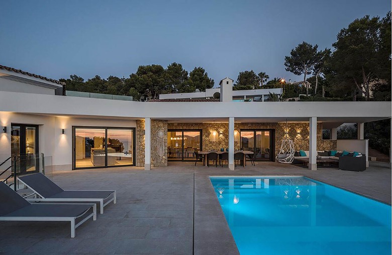 La finca se encuentra situada en el paisaje montañoso de Santa Ponça, en el suroeste de la isla de Mallorca. La fachada exterior es de un blanco reluciente con una parte en piedra natural y se integra a la perfección en la arquitectura circundante, creando un efecto armonioso en el paisaje verde y montañoso.
