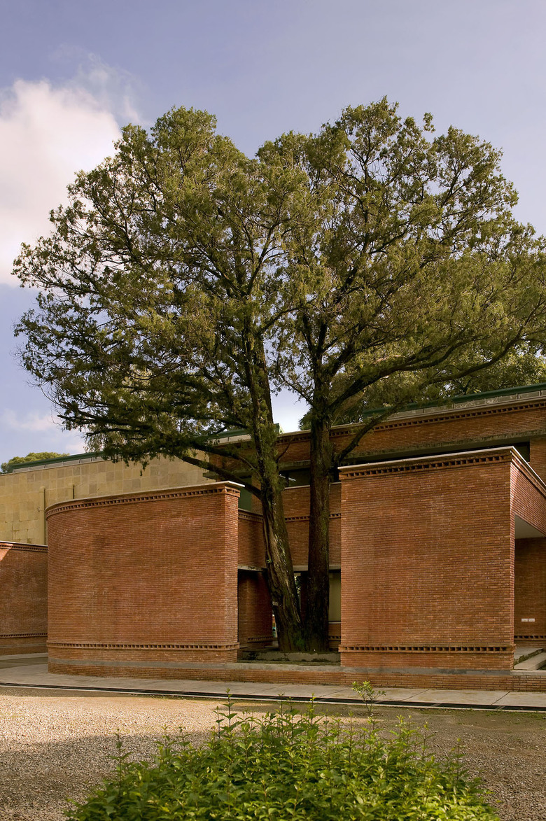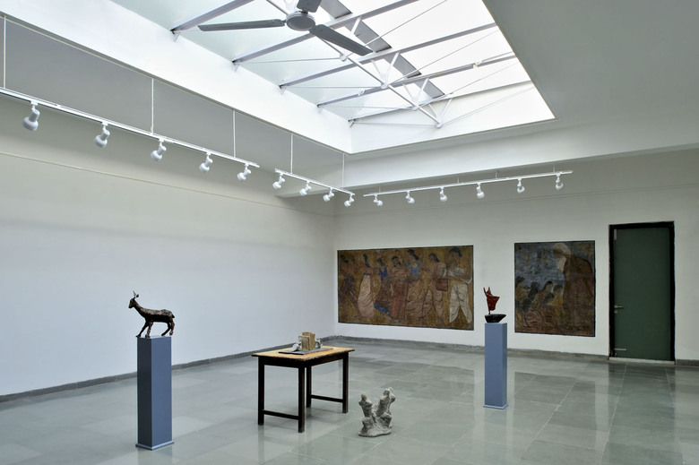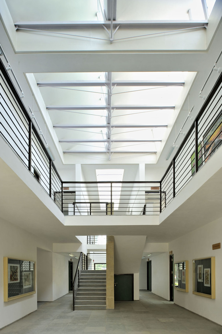 The building is also climate sensitive. The long spine of the building running east-west takes advantage of maximum amount of North light so as to minimize to use of artificial lighting during the day. The temperature within building is kept between a minimum of 16oC and a maximum of 27oC by several devices: Adequate cross ventilation of all the studios and galleries, filtered north light through the skylight system and indirect yet ample light through the courtyards. Exhaust systems in the skylights flush out the hot air and humidity in peak summer via a stack effect. Large overhangs on the south and west side protects the internal volumes from the fierce summer sun. The building has a TERI (The Energy and Resource Institute) Griha Green Rating.