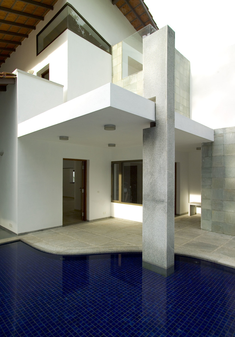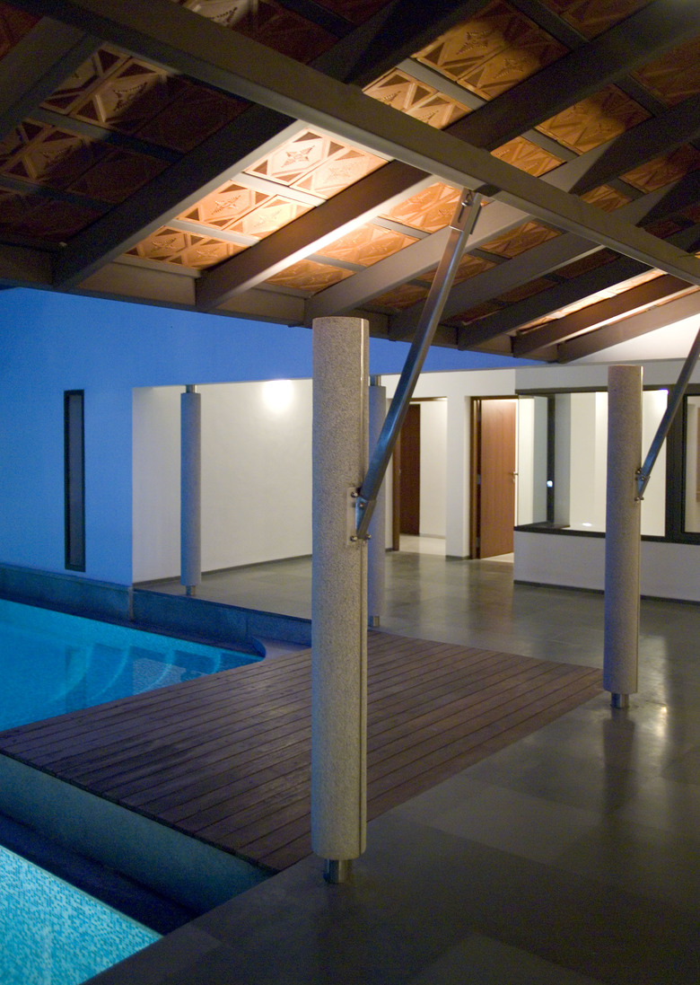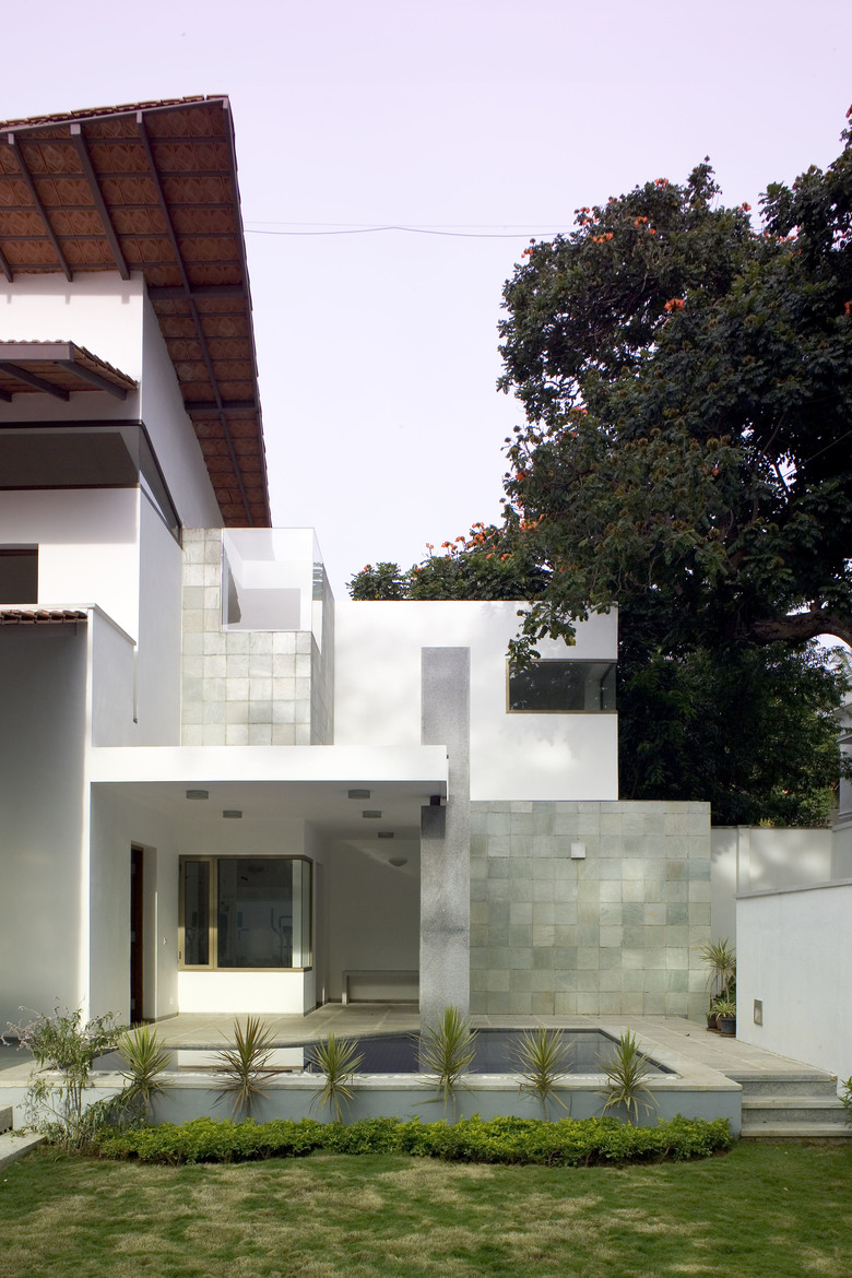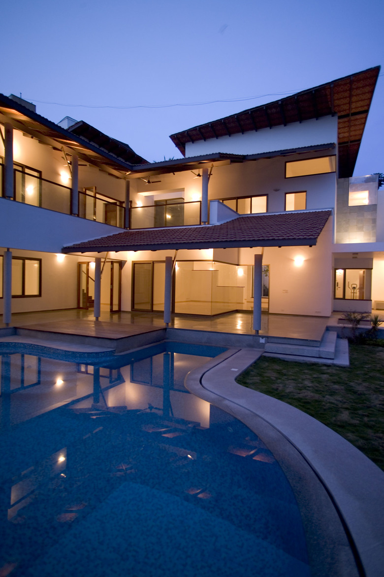 The massing of the house is L shaped and orients itself to a singular lung space in the south. Verandahs on the lower and upper floor covered with sloping Mangalore and Kerala tile roofs overlook this area. The swimming pool is organic in shape and intentionally hugs the lower deck, thus leaving space for an adequate garden.