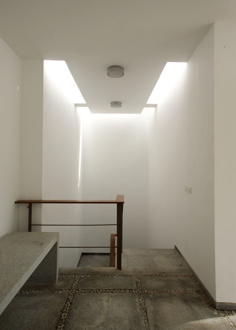 The constrained views on the north and east of the plot (due to apartment blocks built close to the compound wall edge) prompted a design that was inward looking towards the south and west. A rain tree of huge proportions outside the southern wall of the house partially shields the south from the fierce sun.