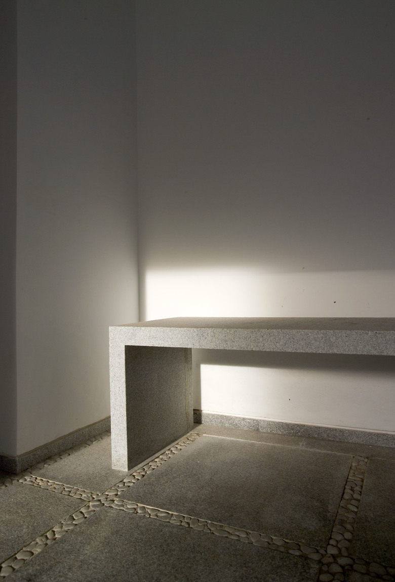 The entrance steps to the court are 6” thick dressed monoliths of sadharhalli stone stacked one over the other like shifting planes. Certain planes and forms in the south elevation are punctuated with a lime green rough slate cladding.
