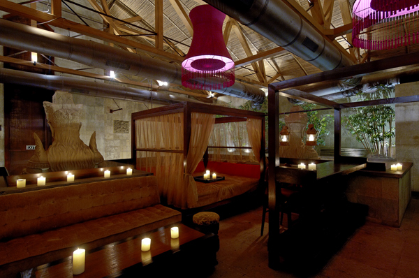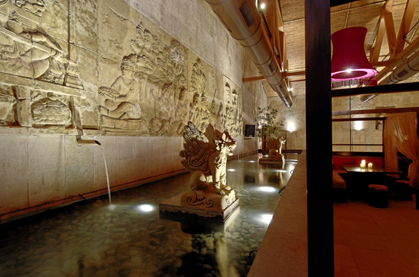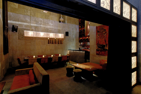 Highlights of the space are the perfectly proportioned south asian statuary and friezes blending in with the monocromatic rusic slate shell of the interior. Set against this backdrop are customized screens of red transluscent teardrops, a dramatic wall composed of repetitive Chinese urns in square niches backlit against a backdrop of floral silk - Or the two portals leading to the private rooms, reminiscent of Japanese shoji screens.