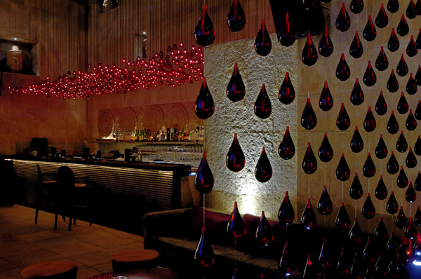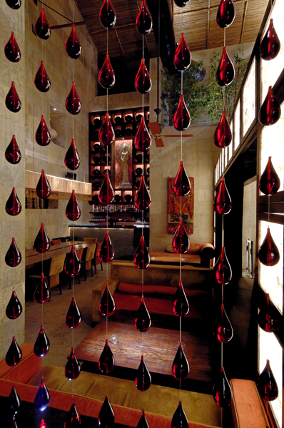 The 20 ft long main bar counter made entirely of hand dressed granite has a dramatic installation of about 500 tiny ruby red lights clustered at varying heights and resembling a galaxy of stars.