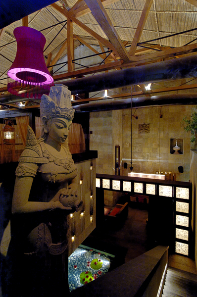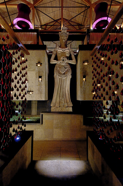 "Shiro", which in Japanese means “castle” has a mysterious aura as you enter its lofty proportions. Crane your head up as you enter through its fortress like doors and encounter the awesome proportions of a 45ft high bamboo clad dimly lit pitched roof. Dominating the central space are three 20ft high figures of Balinese consorts dropping water via earthen vessels into a large moat filled with pebbles and lotuses. These consorts guard an upper room housed in a cantilevered cube of slate stone replete with tiny niches for pillared candles. Water flows gently under this form on horizontal hand chiseled ribbed granite walls into the moat below.